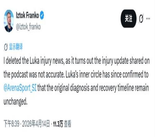 北京时间4月14日,有报道称湖人球星东契奇在西班牙接受的检查结果显示,他的腿筋拉伤伤势比最初诊断的更为严重。记者Iztok Franko先是转发,随后更正消息:“我已经删除了有关东契奇受伤的相关消息,原因是那档播客节目中披露的伤情更新并不准确。东契奇阵营已向《体育画报》ArenaSport 栏目证实,他最初的诊断结果与康复时间表均未发生变化。”