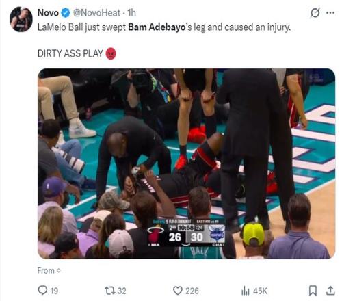 这场比赛非常激烈,在第二节就发生了极其令人愤怒的一幕,拉梅洛-鲍尔在自己对抗倒地后拉拽了阿德巴约的脚后跟,让阿德巴约失去平衡,腰背部直接着地,热巴痛的在地上呻吟。