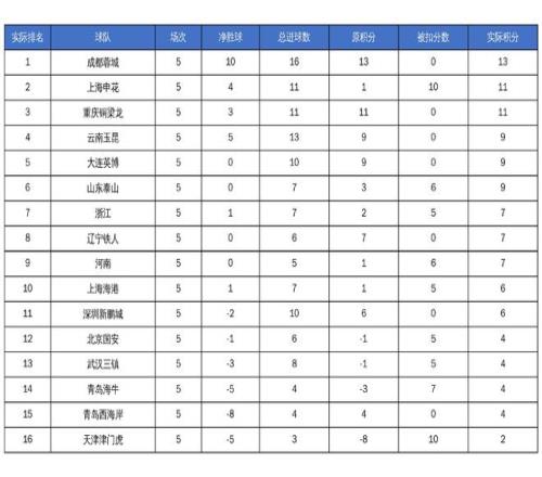 如果被扣分的球队加上被扣分数,成都蓉城仍将领跑,申花将升至第2,重庆铜梁龙和云南玉昆将分别排名3、4名。